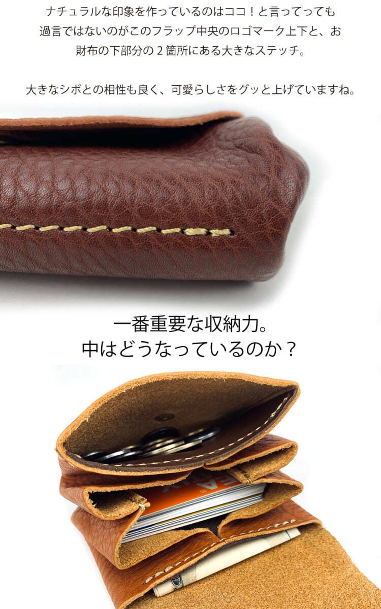 ナチュラルな印象を作っているのは、フラップ中央に入っている2本のステッチ。