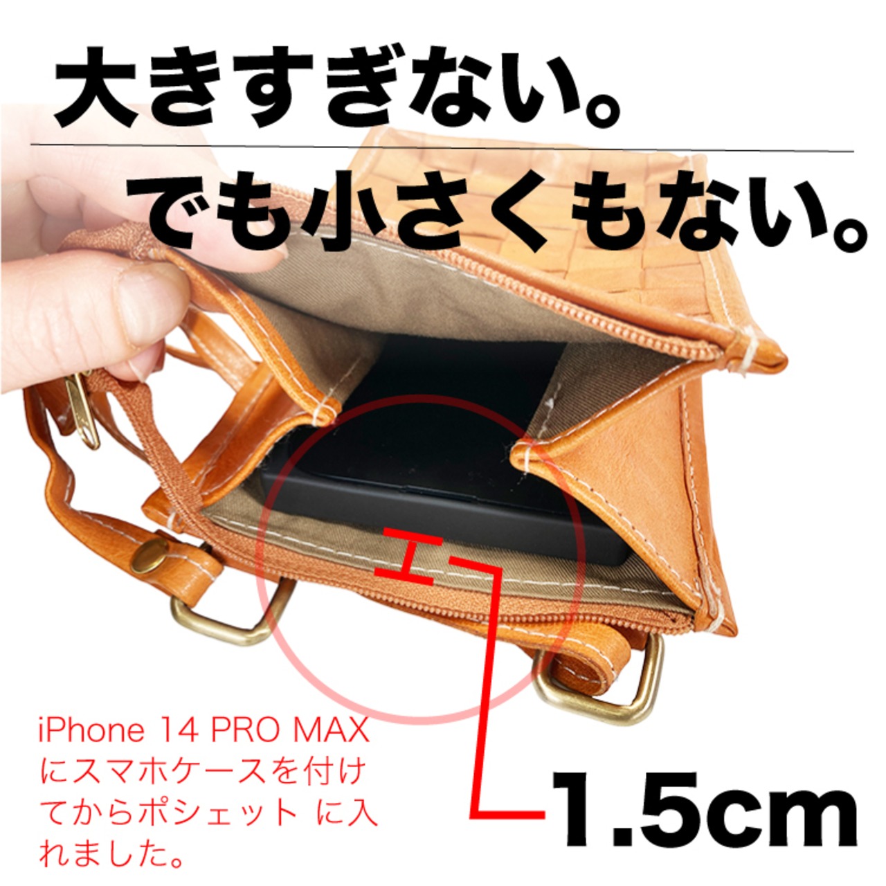 iPhone 14 PRO MAXにスマホケースを付けてからポシェットに入れました。